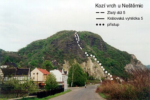 Přesto se našel směr, kudy touhle hromadou štěrku prostoupit. Mezi skalními žebry vede žlab, který je relativně pevný. Volné šutry tu vymlela stékající voda, případně je vylámal mráz. V roce 1994 tu Karel Bělina s Jiřím Chárou udělali cestu Zlatý důl, obtížnosti 5. Ta se letos dočkala i varianty Královská vyhlídka (Bělina a jeho žena Fróna), taky 5 - viz CAO News Děčín, číslo 10/2002.