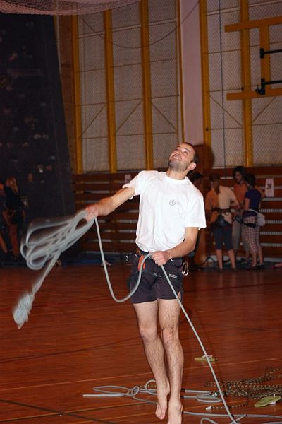 Různých dalších velmi vypečených úkolů byla celá řada, namátkou ještě mohu zmínit pití piva v „nouhendu“, šplhání po tenkém laně se smyčkami, házení kartáčků (na údajné očištění chytu) lezci zavěšenému ve štandu, překonávání tělocvičny s pomocí míčů a bez dotknutí se země atd. atd. Hlavním smyslem klání však nebylo nemilosrdně pokořit všechny protihráče, ale závody si především užít. Vyhráli tak úplně všichni účastníci a každý pak na konci při vyhlášení dostal od Štěpána balíček s hodnotnými a leckdy především vtipnými dary. Myslím, že si pořadatelé docela mákli a připravili nám naprosto netradičně pojaté lezecké nebo s lezením spojené disciplíny. Dokonce je ročník 2010 neodradil, ale naopak je navnadil na uspořádání pokračování v tomto roce, kdy prý připraví přes padesát jednotlivých zcela jistě navýsost geniálních úkolů. Tož – jistě se tam potkáme…