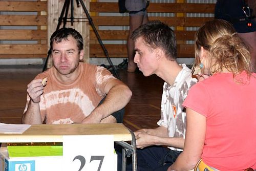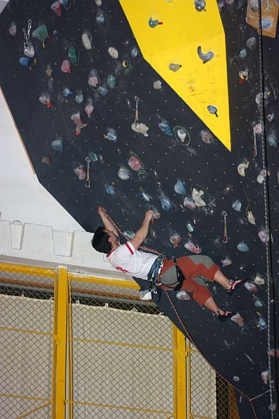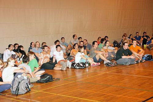 Začátek pořadatelé (Štěpán Neustupný spolu s Jirkou Valachovičem a Vojtou Blahníkem) stanovili na 17 hod a zhruba s dvacetiminutovou sekyrou jsem jako poslední závodník do tělocvičny dorazil i já. Rychle platím symbolický poplatek jako startovné a pln očekávání si sedám mezi ostatní. Organizátoři nás na základě přihlášek s vyplněnými lezeckými zkušenostmi rozdělují mezi čtyřčlenná družstva tak, aby víceméně každá skupina byla vyrovnaná. Každý oddíl má tedy minimálně jednoho člena náležejícího do toho něžnějšího a hezčího pohlaví. Rychle se navlékáme do lezeckého cajku a před námi se vzhůru otevírá zábrana, která dosud zakrývala větší část haly i s lezeckou stěnou. Dohromady se po tělocvičně nachází kolem třiceti očíslovaných papírů, jež obsahují podrobné instrukce k jednotlivým úkolům. Naším úkolem samozřejmě je v daném družstvu co nejvíce úloh zdárně splnit. Každá skupina si v rámci fair play výsledky zapisuje sama na přidělený list papíru.