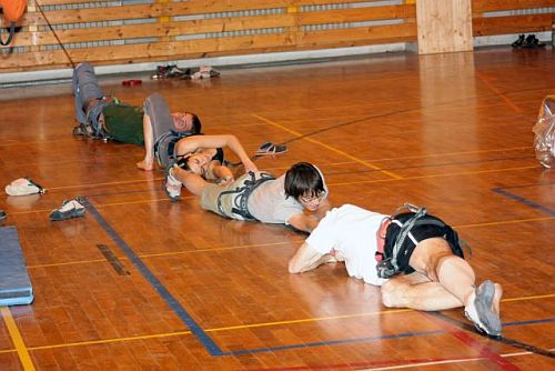 Nicméně spousta úkolů na nás čeká mimo samotnou „umělku“. V rámci tréninku musíme třeba v časovém limitu co nejvíckrát napnout posilovací pružinu. Moje skupina opět jen používá čistě svaly, kdy se v rámci skupiny střídáme a každý z nás jednotlivě napíná všechny své síly. Pak se jen s údivem díváme na další družstvo, které úkol řeší s rozumem a za pružinu tahají v jeden okamžik všichni. Silová úspora je tak zcela zřejmá… No nic, tak se alespoň vrháme do překonání divočící řeky. Z každé strany tělocvičny máme napnuté lano a k jeho spojení nám chybí několik metrů. K dispozici máme z eráru již jen jednu karabinu. Naším úkolem je se alespoň na chvíli dostat do vzduchu a to v jednom okamžiku a ve všech členech. Tak se spojilo několik chytrých hlav v naší ryze demokratické skupině, lehce se zamyslelo a vyprodukovalo jedinečný a geniální nápad (bohužel se nám tímto mozky lehce zavařily a od teď již jen – temno). Ve čtyřech si stoupáme doprostřed mezi napnuté konce lan, chytáme se za ruce a v jeden okamžik všichni na zhruba pikosekundu vyskakujeme. Jsme tedy všichni na ráz ve vzduchu, což pro splnění úkolu naprosto postačuje. Nyní se jen poťouchle usmíváme nad snažením ostatních, jak po různu provazují smyčky a na lano se poté snaží zavěsit. Jedna parádní disciplína spočívala ve snězení sušenek v co nejkratším limitu. Asi kdyby nás někde v horách zastihla žravá, tak abychom byli připraveni. Stejně jako kdyby si někdo z nás zlomil někde v divočině nohu a ostatní ho museli odnést na svých bedrech. Samozřejmě jsme to měli ještě komplikovanější, protože jsme se museli přenést z jedné strany haly na druhou v omezeném čase a ještě se u toho komplikovaně prostřídat.