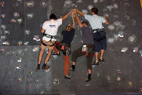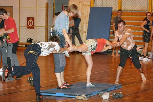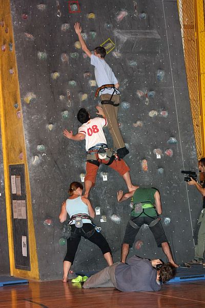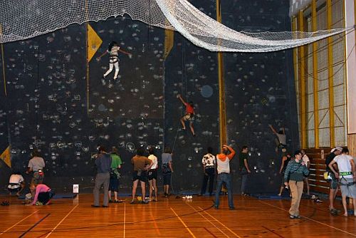 Tělocvična a její vybavení tedy záhy simuluje různé horolezecké terény, v kterých se jednotlivá družstva více či méně úspěšně musejí pohybovat. Spatřit se zde dají lidé trpící sněžnou slepotou, kteří v reálu se šátkem přes oči (a tedy po slepu) lezou nahoru po umělé stěně. Hned vedle nastupuje skálolezec na pískovcovou věž technikou „stavění“ - bez použití jakéhokoliv chytu se musíme dostat cca do půlky stěny, kde se jeden z členů skupiny má chytit velkého madla. Důsledkem je, že po sobě různě šlapeme, trháme si oblečení, padáme – až to nakonec většina z nás dá. Nechybí zde ani bouldrová vložka, kdy je účelem se ve všech lidech traverzem dostat z nástupního chytu do vcelku vzdáleného topu. Samozřejmě se nesmíme chytit jiných chytů, takže zase po sobě různě lezeme, chytáme se kolegovo vyvoněných lezaček, navzájem se objímáme – proč jen zrovna já nemohl mít ve skupině samé holky? Velmi vypečenou disciplínou se stává lezení po určeném segmentu převislé stěny, na němž odspodu až nahoru pořadatelé rozmístili spousty papírků s různými naprosto nezapamatovatelnými slovy. Každý z nás má jeden pokus, který platí dokud si neodsedne, a cílem je zapamatovat si co nejvíce těch ztřeštěných textů. Na rozdíl od přede mnou lezoucí Lenky visím v převise dvakrát tak dlouho, civím na ty papírky a dole si na rozdíl od Lenky nemohu vůbec na nic vzpomenout. Že by se vyplnilo proroctví pořadatelů, že síla se zde opravdu neuplatní…? Za zmínku jistě ještě stojí ryze lezecká disciplína, kdy nás jako že ve vícedélce zastihne pěkný vichr a my se navzájem neslyšíme. Vždy jeden z nás dolézá nahoru do štandu, odklápí zde jeden z na papírku umístěných úkolů a pomocí gestikulace se nám snaží jeho obsah sdělit. Tedy např., že již má totálně natečeno, že mu došel maglajz, že ten chyt klouže jako „vepř“ apod. No zkuste si to, když s vámi lomcuje vichr z hor, jež i babákovu stodolu odnes…