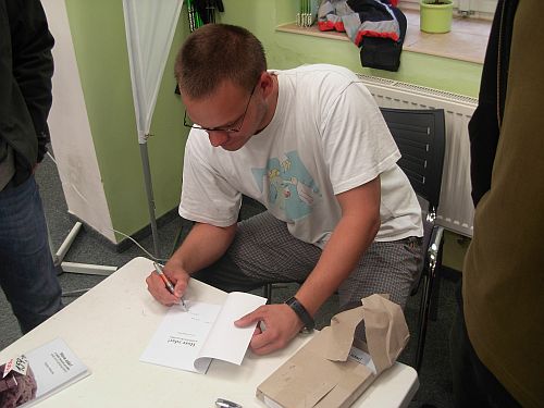 Autogramiáda autora knihy "Hore zdar! a další lezecké povídky aneb cli-fi (climbing fiction)" Václava Wennyho Kňourka, loni na festivalu v Teplicích nad Metují