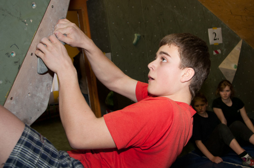 A jaké byly cesty? Tentokrát trošku jiné a velice zábavné! V kvalifikaci se lezly po skupinách čtyři bouldry flash po čtyřech minutách, první skupina měla minutu navíc. Každý chyt za nástupem jeden bod a za podržení topu dalších deset, ať se to dobře počítá (počítá to Danovo super tabulka s tisíci vzorci, která umí započítat i pokusy - ještě že ho máme). 1. boulder byl nástup z hrany doleva přes trojúhelníkové struktury v koutě a top ve stropu, vtipně protlačit to byl pro někoho problém, pro mnohé hračka (Sentík si z nás pořád dělá prdelky a tentokrát má krásnou fotečku jak topuje s rukama za zády).