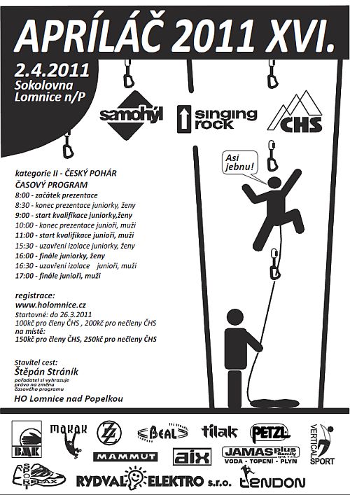 2.4.2011 pořádá HO Lomnice tradiční Aprílový pohár.  Stavěč závodů je Petr Solanský. Věřím, že postaví kvalitní cesty a že si všichni kdo přijedete výborně zalezete.  Leze se dle platných pravidel ČHS.