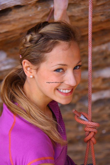 Docela mě baví to, jak má ta holka na všech fotkách pořád stejný barbie výraz, i když leze 8c+, viz. fotky na http://www.magnusmidtboe.com/. Ale jinak šílené výkony...