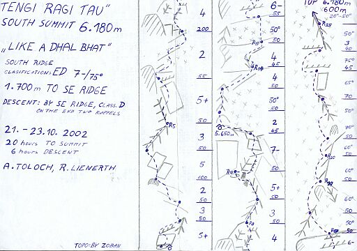 Po trech dnech nadherneho klasickeho lezeni v perfektni skale i ledech, se nase telicka ocitli az na samem vrcholku. Fantasticky zazitek lezeni po perfektni zule s Everestem a Makalu na pozadi se snad neda slovy ani vylicit. Tem z vas kterym to neco rekne prikladam nakres v priloze a muzu rict ze to neni az tak tezke jako treba Cheap Wine, ale o to je tato cesta klasictejsi a prozitkove hezci, no a mimo jine jsme si v ni na par mistech i docela dost zalezli....