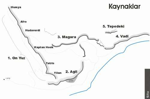 Přístup ze samotného Kaynaklaru je již snadný a dá se říci i příjemný. Z Kaynaklaru z malého náměstí pokračujeme dále do svahu, minete mešitu až se dostanete na prašnou cestu. Po asi 150m od náměstíčka, je po pravé straně zeď s vyvedeným potrubím a asi čtyřmi hubicemi s pitnou vodou, po nabrání vody tedy pokračujte ještě asi 20 m a pak se dejte doleva přes potok přes malý můstek a dále pokračujeme rovně do kopce. Po levé straně jsou některé ploty a domy, pak se cesta stáčí u posledního domu doprava asi po další půl kilometru se dostanete se na louku pod stěnami (Ön Yüz), která je ideální pro postavení stanu.