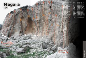 Je virtuálně rozdělen na levou a pravou část a uprostřed umístěnou mohutnou jeskyní. Cesty spíše těžší, mimo spodek a levou část. Perfektní skála, dobře odjištěno.
