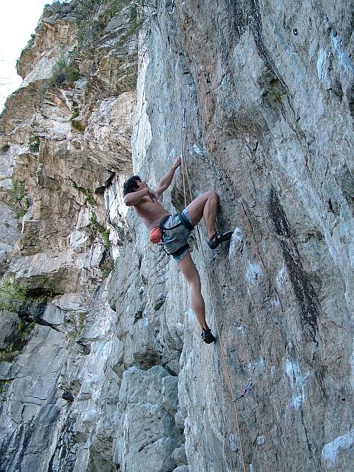 Ale jsou tu i lepší oblasti, proto ještě večer prcháme na vždy přívětivou Ponte Brollu settore est.  Další den další experiment a zase trochu šlápnutí vedle: sektor  Prato. Monumentální stěna vysoko nad údolím, dlouhý přístup autem, dlouhý pěší výšlap a až pod stěnou zjistíte, že ta převislá bílá stěna hostí cesty od 7c+ po 8b. To kvantum 6céček je zase na černé plotně rozpečené od sluníčka. Ale jo, nakonec jsme zalezli, ale 8áčkař by si tu zalezl daleko líp. Doporučit tady můžu asi akorát cest Bullog 6b+, krátká silovka s tvrdou klasou na sražení sebevědomí.
