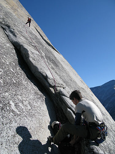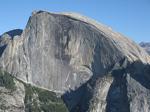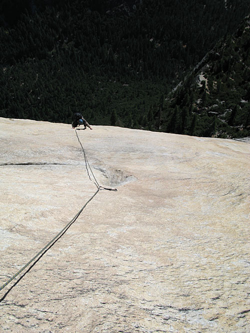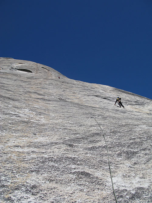 Cesta vede přímo obrovskou stěnou, která je vlastně jedna velká plotna na povrchu mohutné polokoule. Plotnu neprotínají žádné spáry. Jediné podélné útvary jsou tady tzv. dajky (z angl. dike), což jsou křemencové žíly vystupující z povrchu. Tady ovšem nedosahují takových rozměrů jako třeba na Half Dome slavná Snake Dike. S tím souvisí i to, proč máme jen pár expresek. Vkliňovadla jsou tu na nic a cesta je odjištěna nýty, a to v naprosto fantastické hustotě. Aspoň na plánku se ty řady křížků zdají být krásně nahusto. Ale když pro jednotlivé délky vydělím jejich počet délkou ve stopách (v místních průvodcích vždy precizně uvedeno), je jasné, že ani tady se padat nedoporučuje.