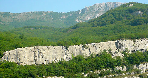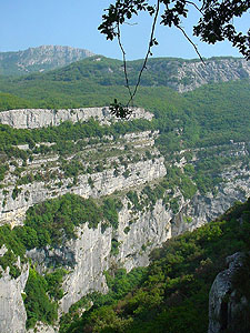 Vápencový kaňon nalevo ověnčený oblastí Courmes  Lezení v centrálním sektoru