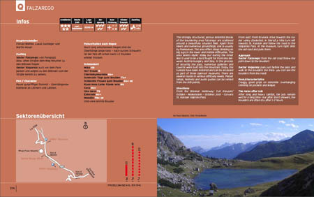 Jak už jsem psala, tento dvoudílný průvodce si vzal za cíl zmapovat veškeré nejznámější boulderingové oblasti v Alpách. V prvním díle autoři představili oblasti mezi Sustenpassem (Švýcarsko) a Innsbruckem (Rakousko). S pomocí mnoha tamních lezců vytvořili přehledy všech boulderů a náčrty přístupových map. Samotný silák Bernd Zangerl v tomto díle odhalil směry v Silvaparku (Silvretta). Některé z nich možná znáte z filmu "Memento - A Boulder Life Line".  V tomto díle také najdete San Giovanni nedaleko Arca, žulovou oblast Val Daone (pouze výběr, který ale stačí na několik lezeckých dní) a samozřejmě jednu z nejznámějších oblastí Alp Magic Wood.