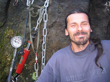 Svůj systém zavrtání na dvou tenkých tyčkách si nechal otestovat Pavel Pájka Rýva. Šrouby velkou důvěru nebudily, ale dopadly nad očekávání dobře. Když několika tunám odolal i jím osazený BH v obou směrech, zářil štěstím a s výsledkem se nechal zvěčnit.