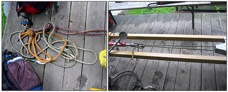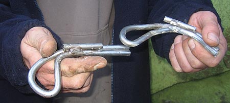 Na řadu přišly také smyčky. Ta právě napínaná pochází ze Skříně a vydržela něco přes dvě tuny, nežli napnutá jako kšanda praskla. Jiným stačilo i méně než 500 kg..