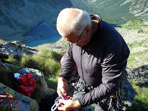 Josef mi do batohu přihodí ještě druhé lano a kladivo a vyrážíme. Během pochodu měníme plány a jako cíl volíme Voliu vežu. Jdeme po chodníku na Rysy a pak pěšinkou kolem bivaků ze kterých lezou rozespalí horolezci. Je příjemně, jasno, nefouká. Svačíme u Žabieho plesa a sledujeme vrtulník jak vynáší materiál na Váhu.