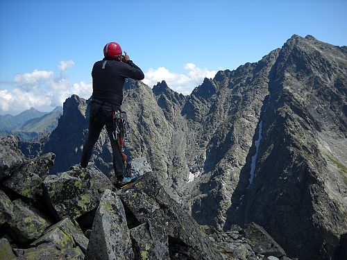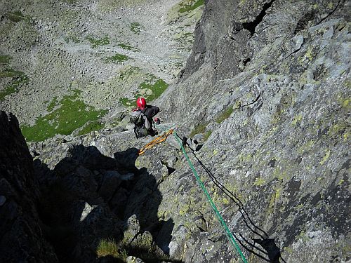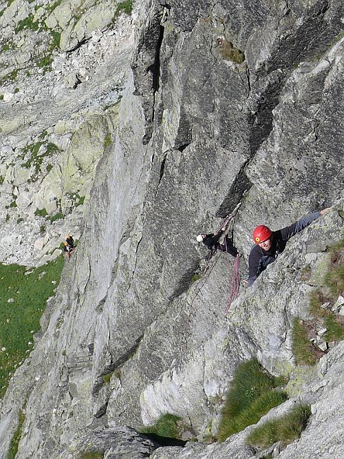 Na delší rozhovor není čas, Josef dobírá lano a já lezu. Skála je studená, lezečky se mi zdají velké a batoh mi překáží. Po ňejaké době jsem na štandu. Přebírám vedení, to je poprvé co lezu v Tatrách na prvním konci lana, trochu se mi potí ruce, ale jsem rozehřátý z první délky tak se mi leze dobře.