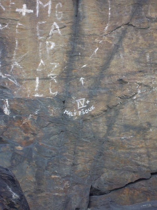 - Údolní stěna nabízí zajímavé cesty v obtížnosti 5 a 6 a raději bych je nepodceňoval (minimálně 7 linií). Sem se někdy vrátím lézt. V pravé části je určitě již všechno vylezené, i když tam nápisy už nejsou vidět a staré skoby ze skály zmizely už před lety.