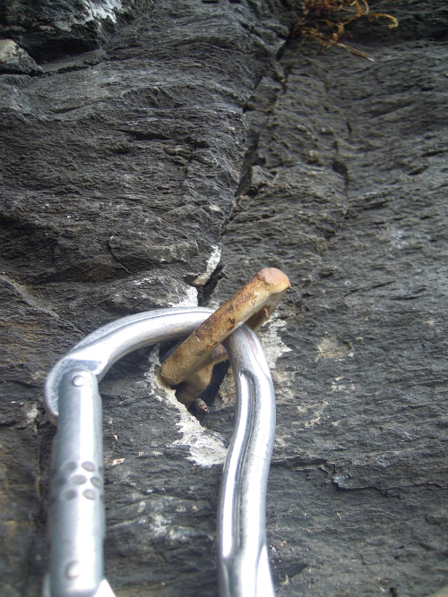 - 90% chytů drží víc než to vypadá, vlastní skála je čistá, trávy minimálně, občas pěkná květina. Na vrcholu jsou dva nýty otočené doprava do údolí (slanění 28 m), téměř jediný jistící bod (řetěz se nekoná, přidali jsme maillonu). Vrcholovou knížku jsme nenašli, ale někde v údolní stěně prý byla.