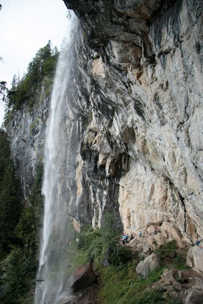 Jako cílovou stanici jsme zvolili rakouské pohoří Wilder Keiser, kde 300m vysoké stěny uspokojí touhy obou dvou, a tak jsme vyrazili vybaveni všemožným matrošem. Po příjezdu na parkoviště pod stěnu jsme v pěkném dešti postavili… no jak bych to popsal … igelit natažený z hagusu od auta a usnuli těšíce se na ráno. Situace ráno však nevypadala o moc lépe a naštěstí po chvíli přemlouvání i Petr usoudil, že jít lézt opravdu nemá smysl. Alternativou pro tento den se nám stal Schleier Wasserfall, který za sebou schovává převis, kam naštěstí neprší.
