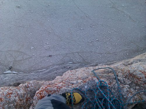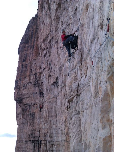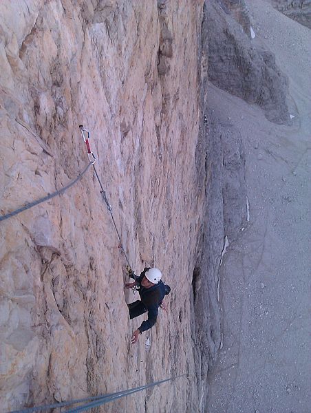 V podvečer příjezdu jsme prověřili nástup a prohlédli si stěnu Za rozbřesku v 6:00 po chvilce váhání, kudy jsme nastoupili do stěny. Petr vybral nejpřímější linii vedoucí středem 600m vysoké severní stěny, cestu Superdiretissima, 9+ Jak uvádí popis cesty na lezci – . Poctivá psychodřina, více jak polovina cesty vede rozbitýma sedmičkovýma a osmičkovýma délkama. S tím nelze než souhlasit, mimo asi 3 délek v pevném dolomitu ostatní připomínají spíše kamenolom, vlastně převislý kamenolom, neboť 2/3 cesty vedou převisem. Člověk si musí rozmýšlet, co bude brát, neboť řada se toho hýbá a největší chyty tím pádem zůstávají nepoužitelné. Petr poctivě funí délku za délkou a já, dokud to jde, lezu co mi síly stačí. Po pár délkách však přistupuji k hákování a následuji svého „horského“ vůdce od expresky k expresce přes nejtěžší délky. I tak je to ale docela rychta.