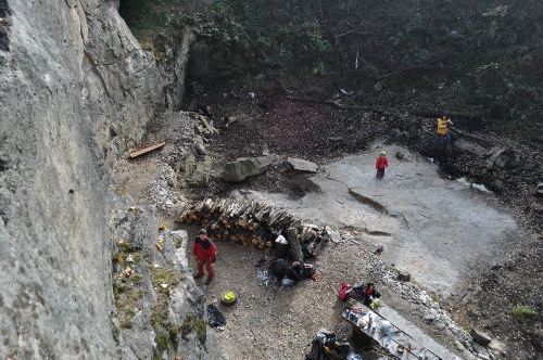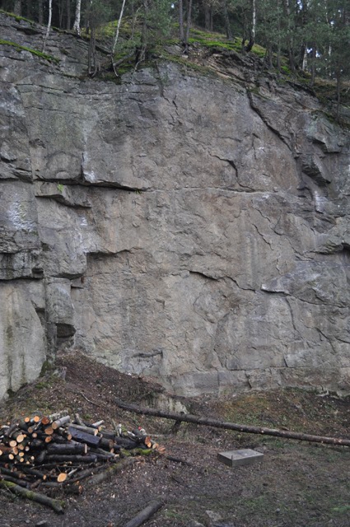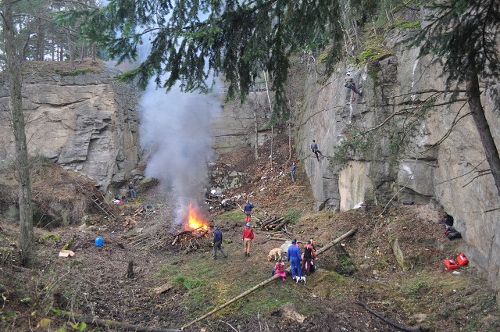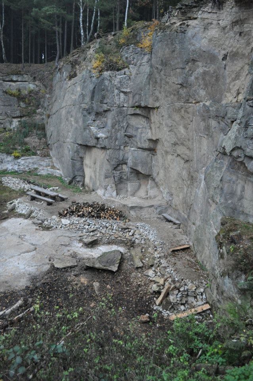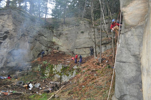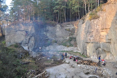 Od auta je to kousek. Stojím tam a nahlas závidím. Stromy, křoví i skládka se dá odmyslet. Ten lom je daleko větší než ten u nás! Petr mi ukazuje nějaké směry co už kluci zkoušeli s horním. Možnosti vlastního jištění jsou dost špatné.