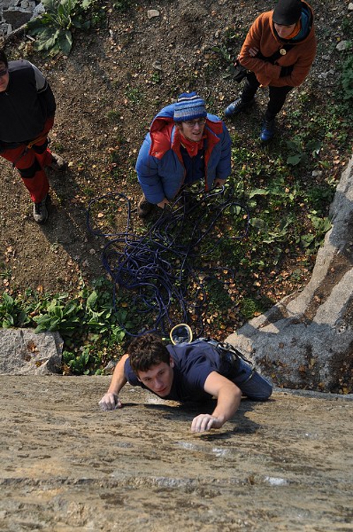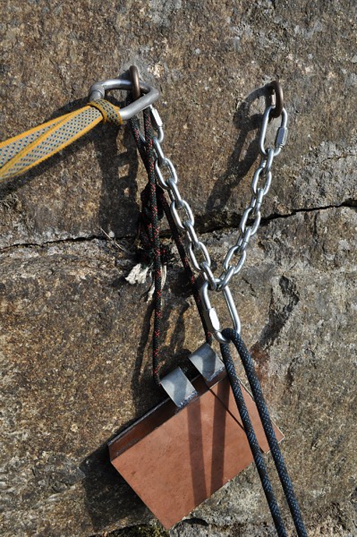 Slaňáky neřeší vůbec nic - to je stejné, jako přivázat lano na strom. Naštěstí je skála téměř suchá, voda stekla. Kde začít? Navrhuji směle Petrovi, že zalepím borháky do dvou nejlehčích linií. Tak, aby se ty cesty daly lézt zdola. A cvakat. To bude něco! Petr mi pomáhá přivázat lana, podává mi materiál, fotí a sleduje vrtání.