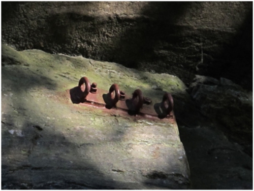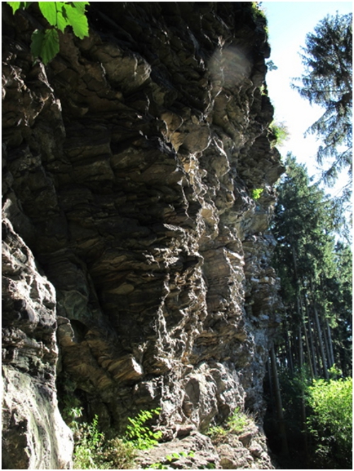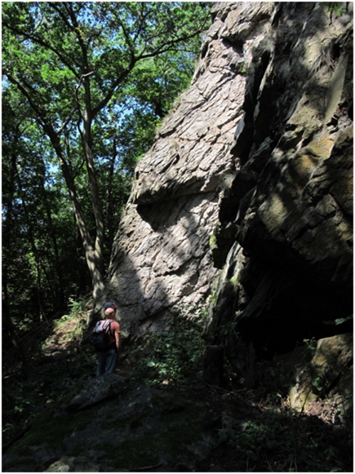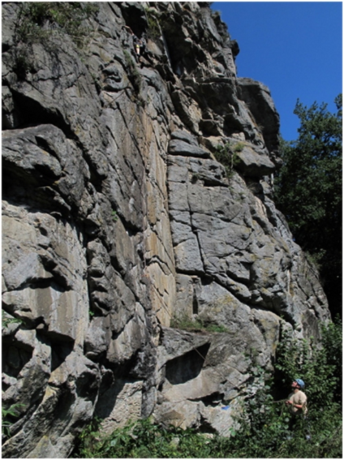 - Stěna Pohraniční stráže, která mne zaujala kvůli výšce 40 metrů a počtu cest. Skála z dálky působí lákavě, tak se radostně probíjíme bodláky a kopřivami k nástupu. Na seznámení s oblastí dáváme cestu Špatná předpověď (nomen omen?)- čtyři bórky, obtížnost 5+, nějaké friendy mám sebou tak není co řešit. Ještě bych rád poznamenal, že jsem tuctový lezec, lezu cca 20 let a motám se max. kolem franc. 6c-7a, skalky, písek, hory. Takže 5+ by mělo být v pohodě. No, cestu jsem vylezl, ale nebylo to příjemné lezení- zvětralá skála, volné šutry! Friendy vcelku k ničemu, zakládat je za volné bloky nemá smysl. Tak jsem cvakal jen bórky a kluci dole před padajícími kameny ustoupili do uctivé vzdálenosti. Vedlejší cesta Podmírák byla to samé, akorát o jeden bórek míň. Tak jsem ještě dal Kamelota 7-, tady už začátek byl pěkný, ale dolez je opět lámavý, když pod vrškem vyletím i s chytem, balíme a odjíždíme zkusit štěstí do další oblasti.