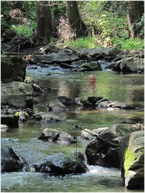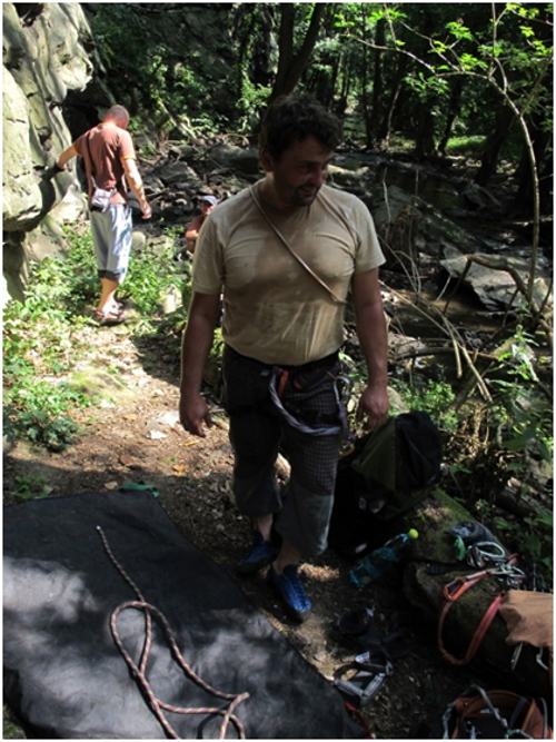 Neděle, sektor Skály u řeky. Zajímavá byla Stará cesta 6+ na Pilíř, k tomu ještě dáme nějaké lehčí cesty, bohužel i tady je kvalita skály proměnlivá. Nakolik vrcholí léto a je hodně teplo, všichni jsme zlití potem a někteří nepohrdnou koupelí v říčce (já bych tam nevlezl, nevoněla zrovna vábně). Tady už končíme, čas pokročil tak ještě pivo ve stylové hospodě ze staré sýpky v Jevišovicích a vracíme se domů.
