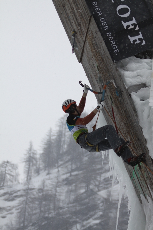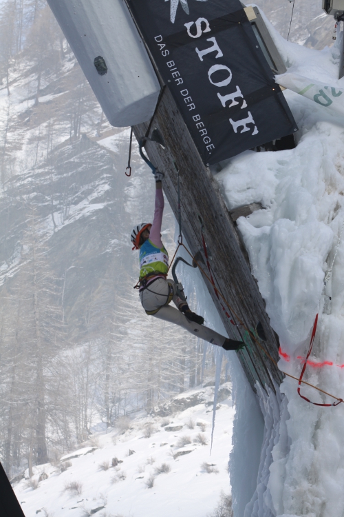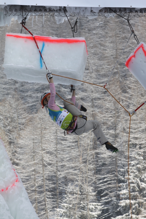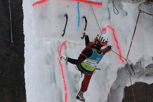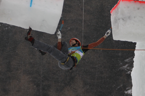Kvalifikace chlapů vedla v první půli jen v ledu, paragánovalo se v ledových blocích, které byly i celkem daleko od sebe. První šel Petr Adámek . Petr se zlepšuje každým dnem. Velice jistě přešel první ledovou pasáž a v zavěšených ledových blocích se pohyboval velice jistě. Bohužel zavěsil cepín do jedné z předvrtaných ledových děr a cepín mu nešel vyndat. Pokoušel se o všemožné fígle a v momentu, kdy už cepín povolil mu vypadnul z ruky. Se zašprajcovanýma cepínama v ledových děrách bojovali i mnohem špičkovější lezci, ale někdy se to tak už stane.