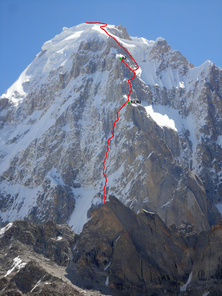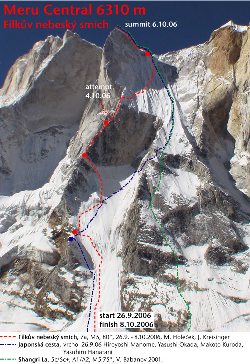 Mt. Meru, nákres směru "Filkův nebeský smích" 7a, M5, 80 stupňů.