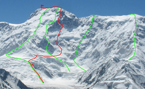 Pik Pobeda, 7439m. zleva doprava: Abalakov Route, North ridge, 6A, 1956, 2939m. Smirnov, 1982, Dollar's Route Denis Urubko Route (Dollar Rod), 2011, 6B. Verblud (Camel), Sokolov-Gorelik, Pobeda West (6918m, Vazha Pshavela) via butress of NW Wall, 2009, 6B, 65 °. D. Medzamariashvili, 5B, 1961, West ridge via Pobeda West (6918m, Vazha Pshavela), 8650m, 35º.