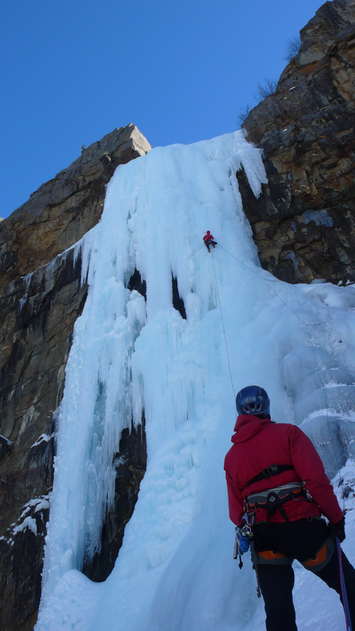 První den byla probrána technika lezení v ledu, specifika jištění a dostali jsme spoustu dalších informací a samozřejmě se lezlo. Další dny už jsme se vydávali slézat okolní ledopády rozděleni do družstev dle výkonnosti. Většinou už v zaběhnutém poměru „dva učni, jeden mistr“.