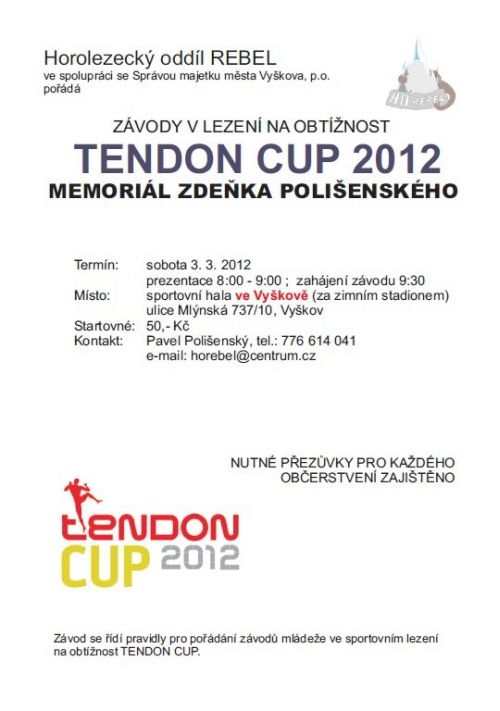V sobotu 3. března se koná ve sportovní hale ve Vyškově (za zimním stadionem) závod v lezení na obtížnost- Tendon Cup 2012.