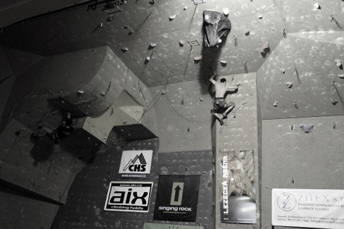 17:50 Kuba Hlaváček vzlíná finálovou cestou. Ve stropě neudrží předposlední chyt před topem a padá. I tak to stačí na další slavné vítězství.