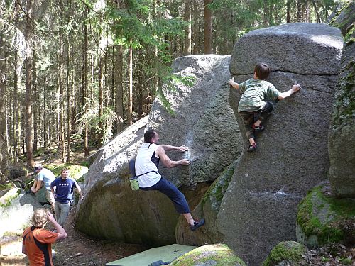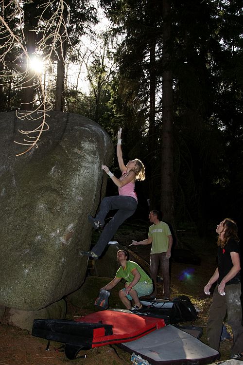 Byly boulderistické. Takhle nějak si představuju bouldering, na jedné straně kopec techniky, hledání, vymýšlení – charakter pěkně vystihnul jeden z účastníků, když řekl, že si poprvé při boulderingu prodřel dlaně, druhou výjimečnost konstatoval Adam, když prohlásil, že se tu dá lézt bez průvodce, protože ty linie jsou prostě jasně vidět. Jo a ještě jedna věc – řada věcí se dá lézt bez matrace, nebo s jednou malou, protože dopady jsou prostě parádní. Samozřejmě, že to rve a to horko tomu neprospělo, ale to už tak nějak všichni víme.