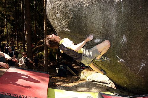 Z kategorií začněme úplnou novinkou, tedy MČR v přírodním boulderingu. Skepse z téhle (alespoň mému ponětí přírodního boulderingu malinko odporující) věci se rozhodně nenaplnila. Obtížnost boulderů dostatečně zastrašila a počet do deseti závodících v obou kategoriích byl akorát. V téhle soutěži fakt rozhodně nechceme jít po počtu. Jediná sebekritická výtka je směrem k obtížnosti ženských boulderů. Byly tvrdé, ačkoli to určitě ovlivnily i podmínky. Lezení bylo myslím pestré. Byly lišty, byly placky, byly těžké vzpory, paty, akorát toho „Flopa“ nelezl nikdo „flopem“, ale všichni „strédlem“. Pro ty, co to zkoušeli, ve výlezu jsem nabral pomocí paty na spoďáko-odtlak vodorovnou spárku, k pravé patě přidal levou a posadil se na zadek do výlezu. Miluju bouldering a smekám před hrubou silou, s jakou to ti úspěšní přelezli.