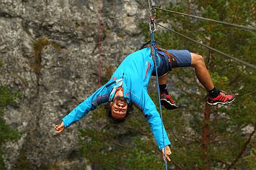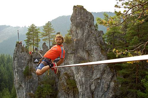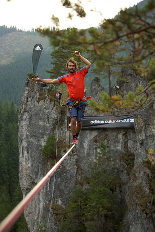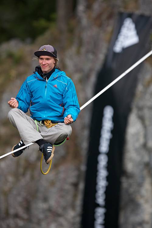 Jedním z vrcholů dne byly výkony slacklinerů Reinharda Kleindla a Lukase Irmlera, během nichž se většině z nás doslova tajil dech. Slackline napnutá 50 metrů nad zemí a západ slunce tvořily dokonalou kulisu představení nejlepších slacklinerů na světě. „Někdy se bojím, ale to napětí je zajímavé,“ prozrazuje Reinhard. Lukas, který je držitelem světového rekordu – přešel slackline v délce 310 metrů – při vzdušné chůzi po popruhu poslouchá elektronickou hudbu. „Tam nahoře je to určitá forma meditace. Nedělám to jenom pro adrenalin.“