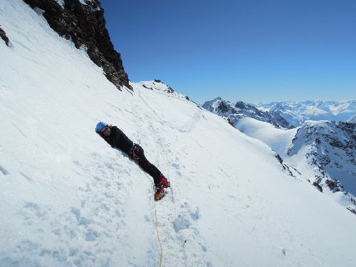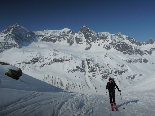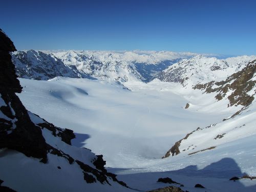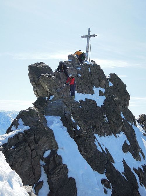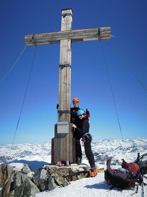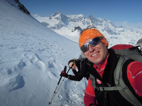Plán na Silvrettahorn 3.244 m jsem odkryl až ráno se slovy, že dojdeme tam, kde zvládne a bude chtít jít. Měl jsem o ni přirozený strach (zase takový magor nejsem) a nad případným okamžitým návratem bych neváhal ani chvíli. V dobrém tempu jsme mnohé předešli, Pavlu trochu ohromilo čelo ledovce Ochsentaler Gletscher, tady však nebyl prostor na siestu, ale přidání do kroku. Výšvih při jeho západní straně je na tvrdém podkladu nepříjemný a bez haršajzen ustřeluje. Pohodlně jsme se dostali až do sedla pod Silvrettahorn, odkud vede na několika metrech poměrně strmý jižní hřeben. Lyže nechali tady a v mačkách stoupali nahoru. V těch exponovaných metrech (cca 45 - 50° dle podmínek) jsem Pavlu odjistil a následně jsme dorazili poslední metry k vrcholovému kříži. První její slova nahoře: „Tomi, až se dostaneme dolů, tak tě zabiji…“ „Pavli, koukni na chatu a do údolí…“ „Zabiji tě!“ Ten den na vrchol vystoupali ještě čtyři lyžníci z Německa. A když padlo nějaké to slovo a oni se dozvěděli, že je Pavla druhý den na skialpech, tak pěkně čubrněli. Holt, někdo má talent! Už jsem přestal chválit. Zasloužená siesta a velmi opatrně dolů. Pro event. šikovnější zájemce, jde to sjet i z vrcholu! Ne však přímo k chatě! To raději s padákem. Já si ještě vystoupal do sedla pod Signalhornem, abych okoukl další cíle přes ledovec Silvretta ve Švýcarsku (Jen kdyby ty chaty tady nebyly tak drahé…) a společně jsme se vrátili na chatu. Sjezd po ledovci Ochsentaler Gl. po jeho západním úbočí nebývá nikdy kdovíjaký. Prašan se drží v jeho východnější stinnější části. Tady jsou však trhliny. Čelo ledovce prý dost ustupuje a podmínky jsou rok od roku horší. Nedokážu posoudit. Lyžařská túra na Piz Buin a Silvrettahorn to prostě není. Na terásce jsem se zaslouženě přiopil. Jarní skialpovačka má své neopakovatelné kouzlo. Zabití se nekonalo, to byste si nepřečetli tyto řádky. Pavla mohla být na sebe zaslouženě pyšná.