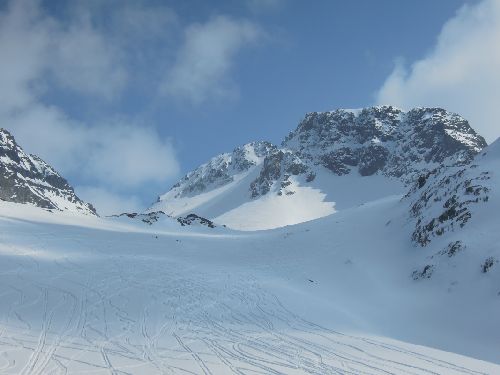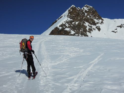 Kam vzít Pavlu na úvod? Prst dopadl na mapě do sedla Tiroler Scharte 2.935 m nedaleko nad chatou. Pohodový výlet pro začátečníka. Ráno objednaná modrá obloha. Před strmým výšvihem nad chatou jsem Pavle vysvětlil techniku otáček v prudkém svahu (začátečník by měl mít haršajzny), zvládla rychle a za chvilku jsme byli v nálevce pod sedlem. Byl jsem překvapen, jak dobře ji to šlo nahoru. Další pochvala! V sedle jsem byl již dříve, ale tehdy nebylo zase tak přívětivě a nedostali jsme se až na Ochsenkopf 3.057 m. Proč to nezkusit nyní? Vystoupit na lyžích až nahoru je svízelné. Lépe v botách a s mačkami. Tady nastal další problém. Pavla nikdy mačky na nohou neměla! Pomalu ale jistě jsem se odchýlil od manuálu, že mačky a cepín nebude potřeba… Zvládne! Nafasovala moje nové ostré mačky, které jsem pro příliš krátkou spojovací hrazdičku nenazul. Krátká instruktáž chůze v mačkách. Jak ano a jak rozhodně ne! A s cepínem v ruce. Svah nebyl zase až tak prudký, sněhové podmínky dobré. „Snad už to není příliš odvážné ode mne?“, pomyslel jsem si. Hlavně aby si hroty neroztrhala lýtka. Chůzi v mačkách zvládla bravurně! Kdo kdy poprvé mačky nazul, nejedna nohavice zůstala neroztržena. Čekal jsem něco podobného, ale za celý výlet si Pavla kalhoty neroztrhala! Pochvala další. Na vrcholu byla radostí bez sebe. Já taky. V ten moment jsem věděl, že jsem získal skvělou šikovnou parťačku, kterou tento sport opravdu nadchl. Na začátku bych si to vůbec nepomyslel. Koukali jsme z prostorného plácku nahoře na fantastickou pyramidu Silvrettahornu, vedle něj stojícího Schneeglocke, Piz Buiny a naproti nám ležící Dreiländerspitze. Pavla podotkla, že na tyto kopce snad nepůjdeme. Ale… Sjezd trochu trápení, sníh nebyl ideální. Já u večeře dlouze přemýšlel, kde zítra. Najdu odvahu Pavlu vzít na kopec naproti chaty? Je to rozumné? Není to už příliš velké riziko? Na něm jsem ještě nebyl a mlsně jsem po něm pokukoval!