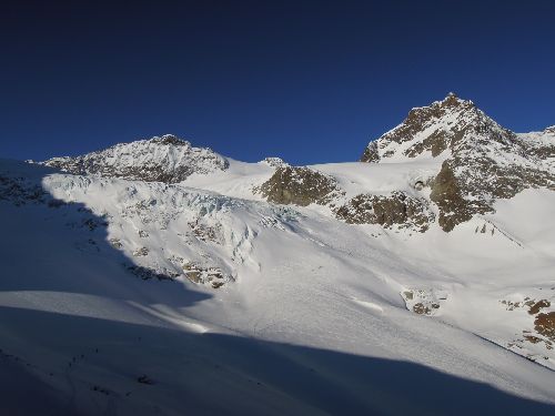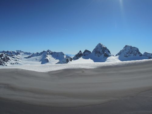 Po ledovci Tiroler Gletscher, za zády Silvrettahorn, Knoten, Schneeglocke, Schattenspitze.