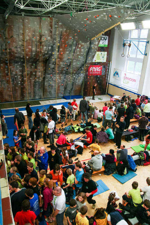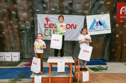 Už kolem osmé hodiny se začali trousit první závodníci a v době oficiálního ukončení prezentace je tělocvična už pořádně našlapaná rodiči, trenéry a hlavně závodníky. A to stojí ještě pěkná řada nezaregistrovaných před stolečkem. Ale nakonec jsou všichni zaregistrovaní, prohlídky jsou zkontrolované a může se začít závodit. Každý rok si říkám, jestli trefíme obtížnost a většinou se to u některých kategorií podaří, u jiných to uděláme lehčí jako třeba letos u těch nejmladších. Ale to je asi problém všech závodů pro děti a zvlášť pro ty začínající. Snažíme se už při stavění, aby mohlo lézt několik kategorií současně. A tak i přes zatím největší počet závodníků od roku 2003 nakonec v rozumnou dobu startují finále jednotlivých kategorií.