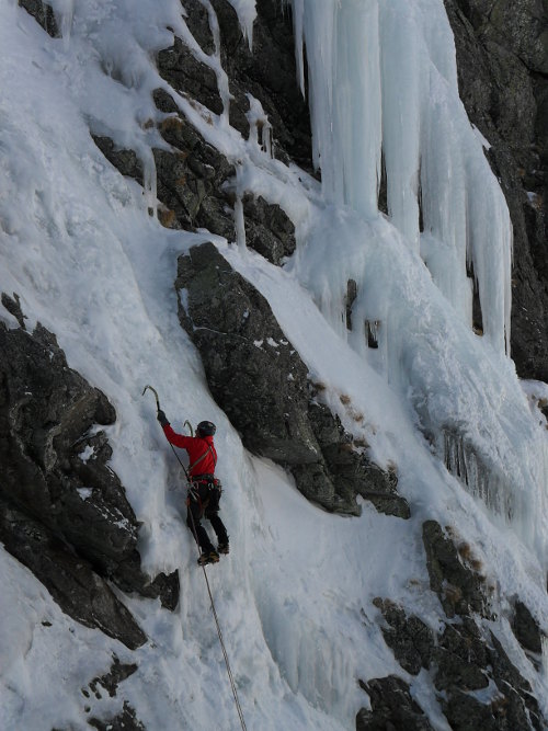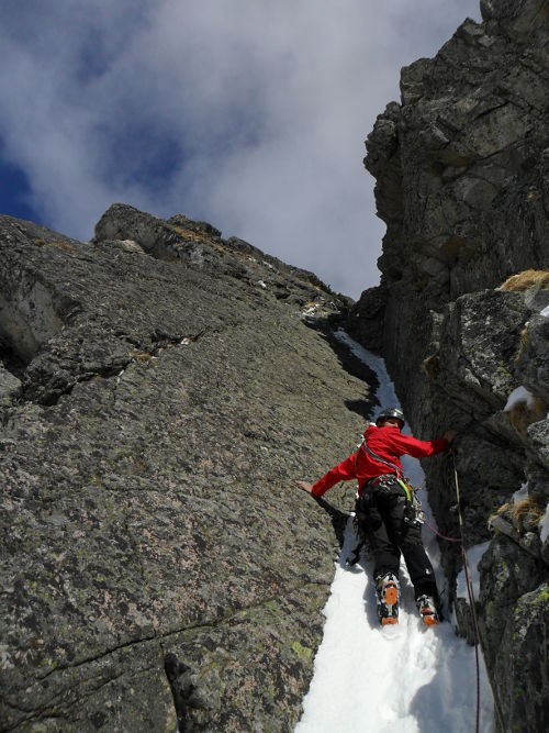 Další den se dělá konečně pěkně, a my tak můžeme vyrazit za další lezbou. Vyhlídli jsme si třídelkovou cestu Koncert se nekonal (4+) na Malého strážníka. Všechny délky jsou krásné skalní lezení s občasnou drnovou pasáží. Užíváme si výhledů na dolinu a ukrajujeme metr za metrem z naší cesty. Sestupujeme po Německém žebříku, a protože máme fůry času, traverzujeme svah směrem ke Svišťovce a lezeme postupně všechny tři tamní ledy. Jedná se o 60 metrové kousky s obtížností do WI 3. V podvečer jsme na chatě a pouštíme se do hodování. Ukecáváme slečnu za barem a dostáváme nedojezené dortíky, které se podávaly na večeři. Dnešní noc se rozhodujeme strávit venku. Chceme vyzkoušet, co vydržíme. Předpověď slibuje celkem slušnou kosu. A taky že jo, naměřili jsme pěkných -28ºC. Jsme ale tvrdí, jak žuly a držíme až do rána.