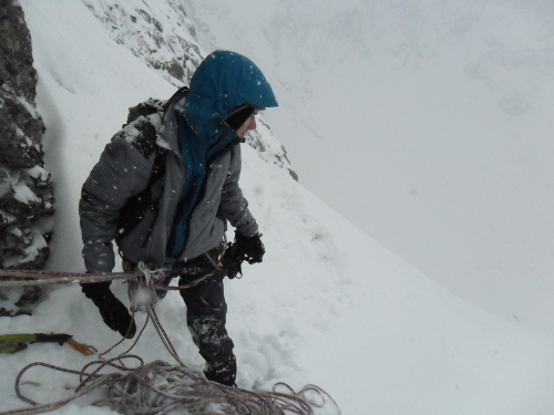 Cesta je sice krátká, ale o vypečená místa v ní není nouze. Hned první délka ždíme náš morál, a tak jsme rádi, že alespoň štand je tutový. Po úvodní lehké pasáži druhé délky přichází klíčové místo. Celkem slušně v něm bojuji, padají na mne prachové lavinky a kvalita jištění není nějak přesvědčivá. Naštěstí po půlhodinovém boji cvakám zdárně štand. Standovi při rušení jednoho jištění padá smyčka s expreskou, a tak se pouštíme do záchranné akce. Slaňuji dolů pro smyčku a následně prusíkuji zpět na štand. Poslední délka je jen hrabačka ve sněhu. Jelikož nepřestává sněžit, volíme sestup slaněním namísto lavinézního Německého žebříku. Po příchodu na chatu se cpeme až k prasknutí a spřádáme plány na zítřek. Předpověď není zrovna ideální, a tak necháváme rozhodnutí na ráno. Jedno je ale jisté, Weberovku si necháme na příště. Není v ní vůbec žádný led a přece jenom se na ní úplně necítíme.