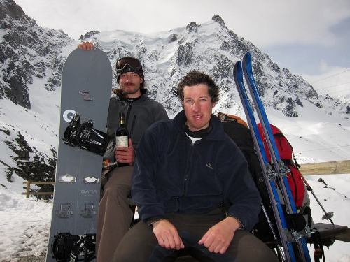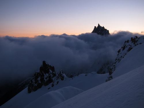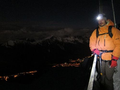 Vyrážíme ve dvě jako jedni z posledních, zatímco světelný had se už plazí vysoko ve svahu. Z ocelové terasy je výhled na hvězdy i na osvětlené Chamonix. Po chvíli dohánění hada vidíme, že se jeho čelo nejprve zastavuje a poté otáčí ke sjezdu. Zachvíli už kolem nás projíždí vůdce a všichni jeho klienti. Vůdce jen v rychlosti pronáší něco o velkém množství sněhu. Zastavuje několik nezávislých skialpinistů a jeden spliter (splitboard Burton S-series 162). Říkají, že vůdce se rozhodl vrátit, protože podnik je příliš nebezpečný, na hřebeni je příliš sněhu. Honza namítá, že zimní normálka dle mapy po hřebeni vůbec nevede, vede totiž širokým ledovcovým žlabem, hned vedle hřebene. Tuto cestu vůdce už večer zavrhnul, protože je prý ohrožena pádem seraků. Nicméně sklon údolí do 30° znamená minimální nebezpečí uvolnění laviny a dle mapy i honzových načtených informací je séraky ohrožen pouze 1 krátký úsek na celé cestě. Rohodujeme se proto pokračovat údolím, 4 nezávislí lezci a jeden spliter se tázavě dívají na Honzu kudy – potom co mávne paží směrem ke žlabu mířícímu k vrcholu bez otálení vyrážejí udaným směrem vpřed. Několik následujících hodin se probíjíme ledovcem mezi trhlinami, překvapuje mě, že většina místních borců se nenavazuje. Někteří odpadají a sjíždí zpět na chatu (jeden se při sjezdu částečně propadá do trhliny). Jak se skupina zmenšuje a stoupá nadmořská výška, naše tempo se také propadá. Pod zledovatělým svahem na hřeben s Valotkou necháváme splitboard i lyže a nandaváme mačky. Zanedlouho už sbíráme síly v závětří Valotky, která nabízí kromě zápachu zvratek a odpadků, gumovou podlahu, velké množství použitých termofolií a nouzovou vysílačku do údolí. Jsou 3 hodiny po poledni a nám je jasné, že vrchol dneska nestihneme. Pochvíli nicméně vyrážíme ve stopách dvou nejrychlejších pokušitelů hory. Docházíme o nějakých 100 výškových metrů nad přístřešek, když je potkáme na sestupu zpět. Řeknou nám, že došli do míst, kde už se nedalo dál postupovat pro velké množství nezpevněného sněhu, který sjížděl i snimi s hřebene.