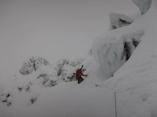 Ráno nás vítá stále stejně spruzelý chatár, tentokrát znechucen naším pozdním příchodem na snídani. Po vydatném jídle složeném z vloček a džemu naplňujeme změnu plánu. Z Midi sjíždíme o lanovou stanici níž, následuje mlžný traverz rozpraskaným ledovcem větší částí severní stěny. Honzova GPS s uloženými trackpointy je v téhle situaci neocenitelná. Obrovské séraky a hluboké trhliny působí impozantně.