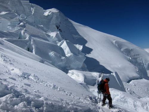 Po několika hodinách dorážíme na chalotte de Mullettes trůnící jako orlí hnízdo na jediném skalisku, které se jako ledoborec zakusuje do nekonečně rozeklaného ledovce pomalu stékajícího širokým údolím z vrcholu hory.