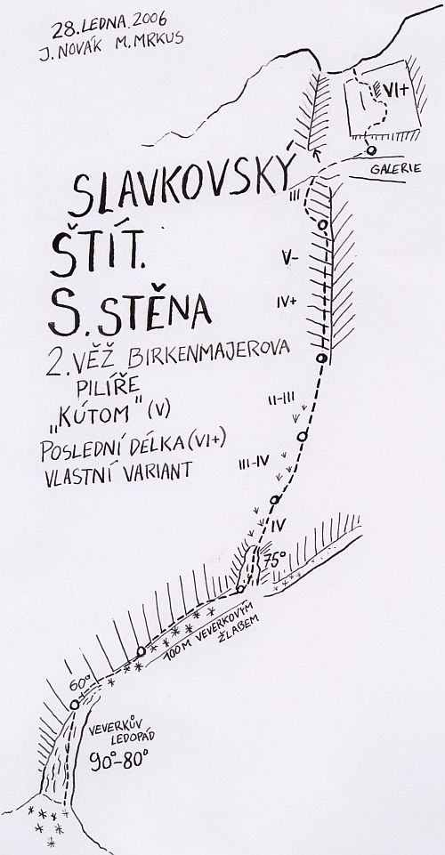 Druhá délka na druháči je v poho. Až do chvíle než se podívám na svou pravou botu. Nevěřím vlastním očím. Celá špička masivní skelety je pryč. Čouhá ven dokonce vnitřní bota. Při lezení sem si ani nevšiml kdy se to stalo. Dolézám na štand a sděluji Kubovi tu novinu. „Je to jenom na tobě, vůbec mi nebude vadit když to teď zabalíme a sestoupíme.“ Bota už je plná sněhu, ale zimu zatím moc nepociťuji. „Nahoru už je to jen skála, žádný sníh.“ A co sestup, vrtá mi trochu v hlavě. „Ale co, když už jsme tady…dem dál!“ Mačky dávám do batohu a začínám jistit Kubu. Následující dvě délky jsou plné nádherného, místy rozlámaného lezení. Bota naštěstí drží. Na konci čtvrté délky lezu kvůli času zrovna dál a vychutnávám si pěkné trojkové kroky. Na sněhové galerii hledám štand. To ještě nevím jak dlouho tady pobudu…“Myslíš že to je ten kout vpravo, nebo vlevo?“ „Nevím, tady to vypadá lezitelněji, nalevo to bude rozlámané!“ Ukazuji směrem do koutu. „Zkusím to a uvidím.“ Kryje mě malý převísek, takže nevidím co tam nahoře provádí. Slyším jenom „tady to nepude, těžké jak prase!“ nebo „vidím smycu, zkusím to tam.“ Po 15 minutách začínám mrznout, přece je už pokročilá doba a sluníčko na nás nevidí. Rukama mě prošlo ani ne 20 metrů lana a dál se nepohybuje. Podezřelé ticho. „Co jeee!!!“ křičím nahoru. Žádná odezva. Začínám přešlapovat a hýbat ztuhlýma rukama, abych trochu zahnal zimu. „Tak co je, de to?“…Konečně cítím tah v laně a slyším skřípání zbraní. Po dalších pěti minutách se z vrchu ozývá „uaaa, zruuuš. Přivaž na jedno lano batoh a já ho vytáhnu!“ Provádím a po nekonečné chvíli se pouštím do poslední délky, která překvapila svou obtížností. Hodně tvrdé a vyrovnané kroky, obtížnostně kolem šestky, mě vedou do poloviny délky, kde pro mě nelezitelnou část řeším elegantním zhoupnutím do lana. Tím se dostávám asi tři metry vlevo a zdárně pokračuji na vrchol druhé veže Birkenmajerova pilíře. Tam zjišťujeme, že slunko už nefunguje a dáváme se na sestup Královským žlabom, naštěstí nelavinózním…