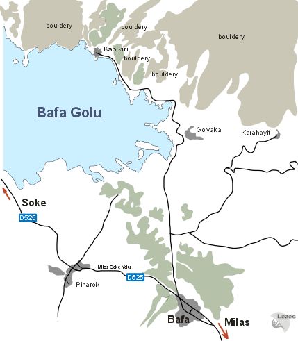 Nejbližší letiště je Milas-Bodrum a nebo Izmir. Pokud plánujete jet jen do Bafa Gölü, Milas-Bodrum letiště je nejlepší, je to jen něco málo přes 1 hodinu jízdy od Bafa Gölü. Pokud plánujete používat veřejnou dopravu, nebo trip jako my spojit s návštěvou jiných skal a jiných zajímavých míst, tak Izmir letiště je lepší. Pak je dobré si zajistit auto (my jsme měli (menší Huynday za 19 Euro na den). Ale lze to také zvládnout hromadnou dopravou, autobusem, který jezdí mezi Izmiru a Milas (požádat řidiče, aby zastavil v Bafa). Z Bafa je 10km do Kapikiri, takže buď pěšky nebo taxíkem. Taxi by měl stát něco 10 - 15 €.