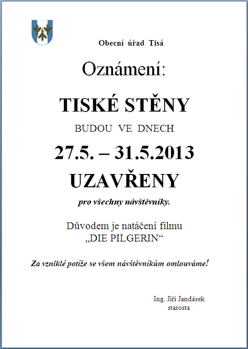 malaObecní úřad Tisá oznámil přes ČHS, že Tiské stěny budou ve dnech 27.-31.5.2013 UZAVŘENY pro všechny návštěvníky z důvodu natáčení filmu „DIE PILGERIN“.