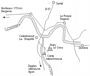 Tato "promise land" se nachazi nedaleko Bergeracu a Sarlatu, jen co bys kamenem dohodil (175 km)od Bordeaux. Melo byt hezky, alespon v to jsme doufali, vyslechnuvsi predpoved. Do skal jsme dorazili v pozdnich vecernich hodinach, ale byla to celkem prijemna cesta, protoze kdyz lezci vyrazeji na jih a to je vzdy krasna cesta plna prislibu.